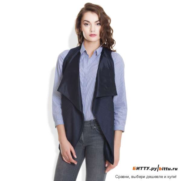 Темно-синий жилет в тонкую полоску на подкладке. Оригинальный крой позволяющий по-разному завершать образ. Сочетайте с юбкой-карандаш и облегающим джемпером. Не большой ремешок выделит линию талию и создаст на ней акцент.