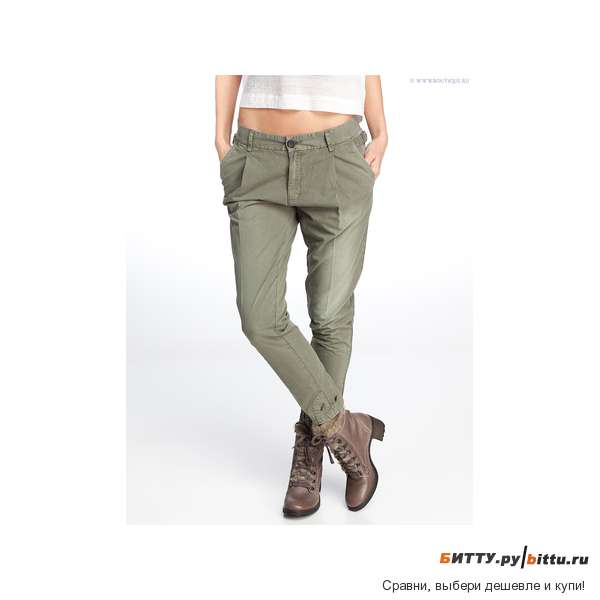 Женские брюки Diesel из хлопка серо-зелёного цвета. Свободная в верхней части модель заужена книзу. Мягкие складки под поясом спереди. Четыре функциональных кармана. Текстильные ремешки с металлическими пряжками по бокам. Ширина брючин снизу может регулироваться при помощи пуговицы и петли. Брюки украшены потёртостями.