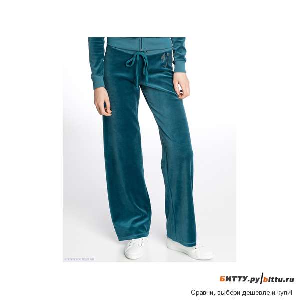 Женские спортивные брюки Juicy Couture из велюрового трикотажа цвета морской волны. Модель сильно расклешённого от бедра силуэта. Широкий эластичный пояс с кулиской. Брюки украшены логотипом бренда, выложенным кристаллами.