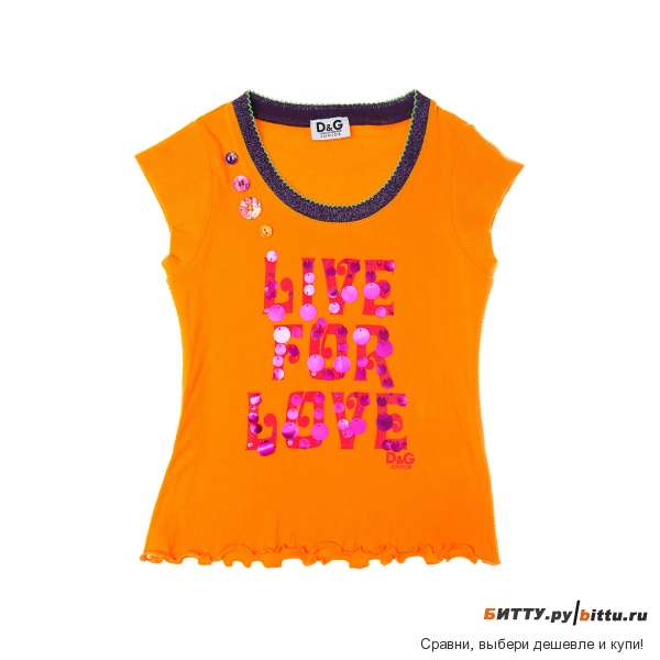 Ярко-оранжевая футболка с укороченными рукавами и глубоким вырезом, отделанным контрастным материалом с люрексом. Фронт активно украшен розовым принтом с пайетками разного размера. Слегка приталенный фасон, волнообразный подол. Оригинальная модель для девочки, которая любит яркие цвета.