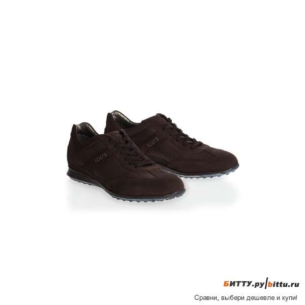 Комбинированные коричневые кроссовки из текстиля и кожи. Устойчивая прорезиненная подошва и застежка на шнурки. По внешним сторонам декорированы фирменным логотипом «Tod’s». Универсальная модель для повседневного гардероба. Для прогулок сочетайте с шортами и олимпийкой.