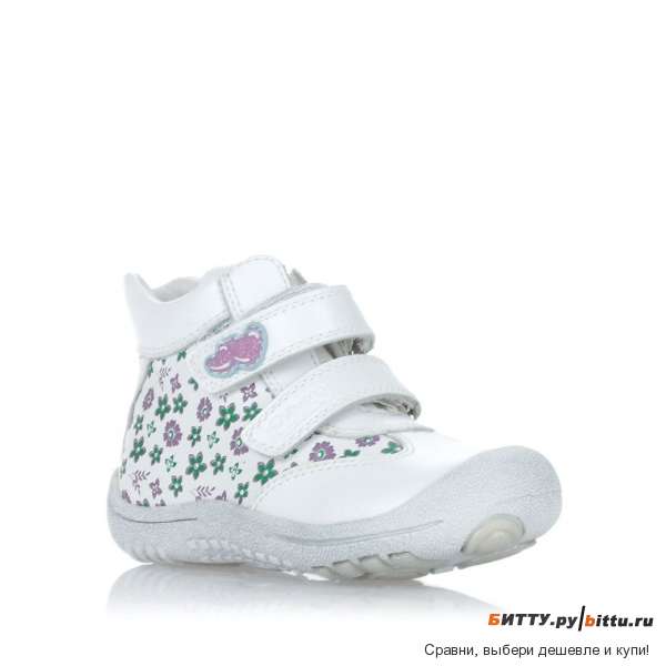Красивые ботинки для девочек от Nats. Модель выполнена из белой кожи и украшена цветочным принтом и белыми вставками. Внутренняя отделка выполнена из текстиля. Модель фиксируется на ноге при помощи ремешков на липучках.